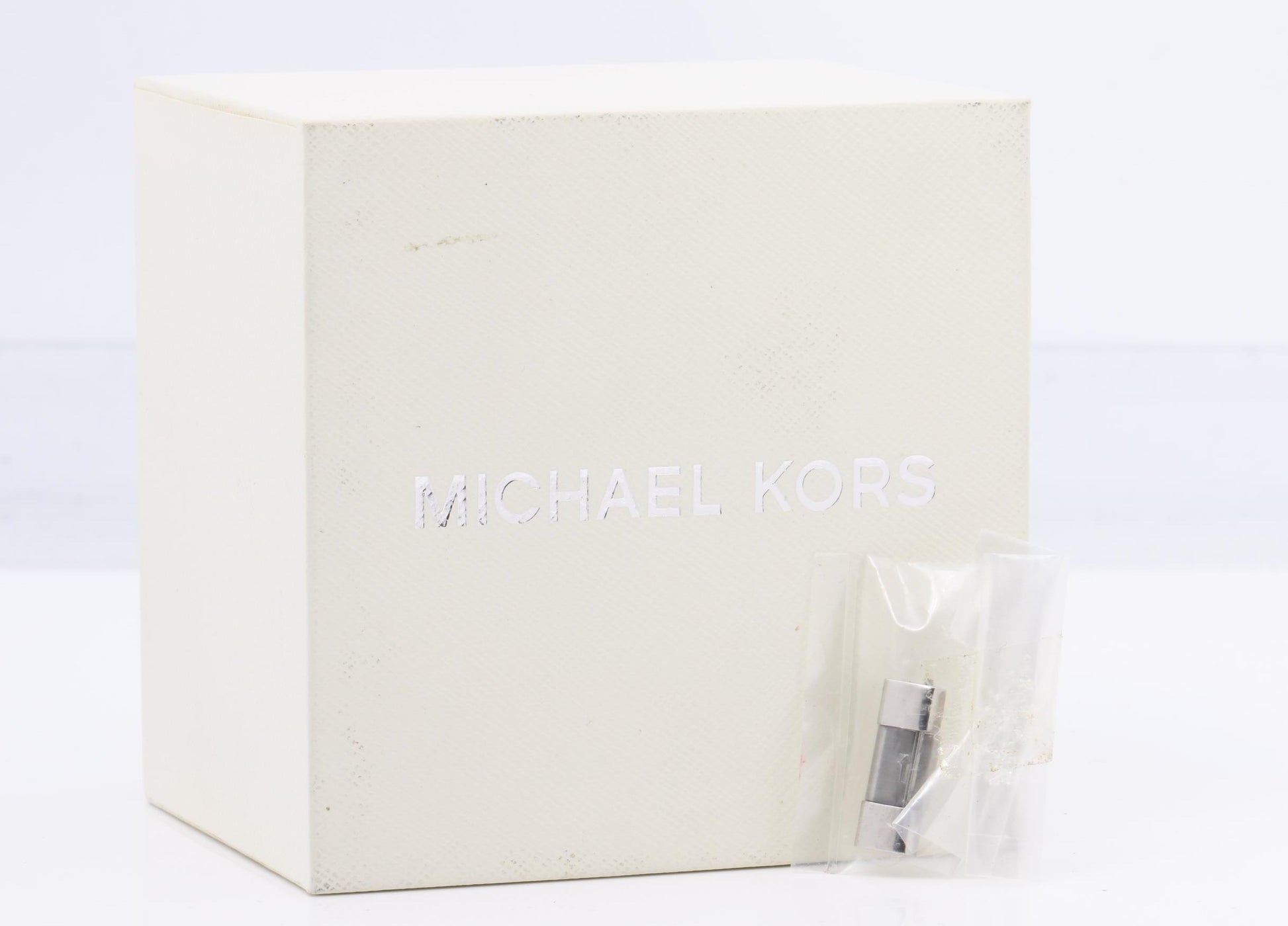Pre-owned but in excellent condition, this watch comes with its original Michael Kors wooden box — a rare addition for collectors and gift-givers alike.